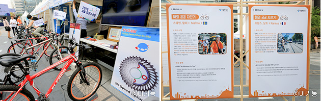 각종 자전거 제품 및 부품을 살펴볼 수 있는 부스들(좌), 해외 공공 자전거 사례들(우)