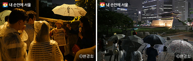 나눠준 우비를 입고 안내 깃발과 함께 서울로7017로 향했다. ‘서울로별빛산책’은 오후 7시 30분부터 약 2시간 동안, 서울로7017부터 시작해 남대문교회, 한양도성을 지나 남산육교, 숭례문 등을 해설가와 함께 둘러보고 걷는 코스로 진행됐다.
