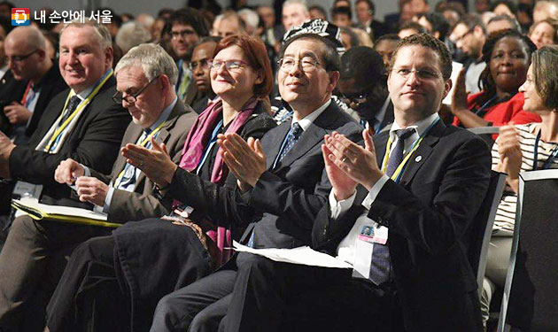 이에 따라 그는 '모든 정부기관과 공동행동을 통한 기후변화대응 목표치 상승'을 주제로 진행된 세션 4의 주제발표자로 나섰다. 사례 발표에서 박원순 시장은 “정책이 성공하기 위해서는 시민들의 참여가 매우 중요하다”고 강조하고 서울의 기후변화대응 우수 시책인 ‘원전하나줄이기’, ‘서울의 약속’ 등을 전 세계에 알렸다.