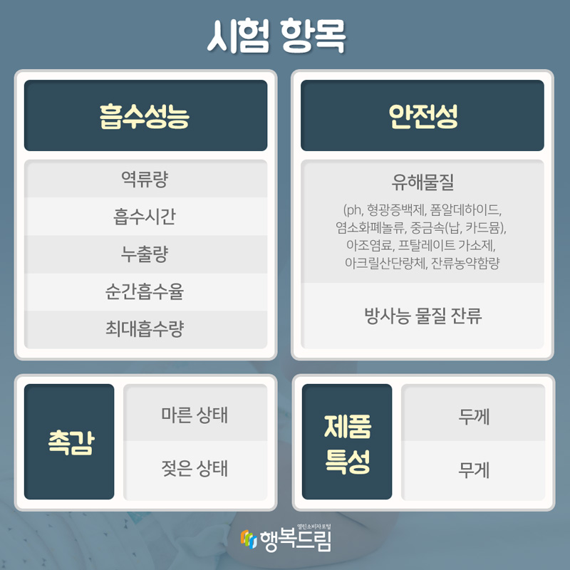 흡수성능: 역류량, 흡수시간, 누출량, 순간흡수율, 최대흡수량