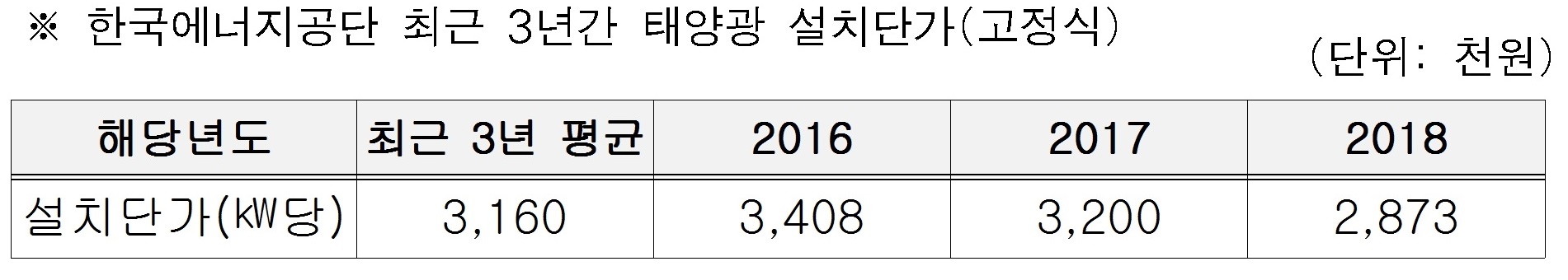 - 또한 태양광 발전시설 설치단가는 한국에너지공단에서 매년 공지하는 ‘신재생에너지 지역지원사업’의 설치단가를 적용하고 있어, 공단의 최근 3년('16~'18)간 평균 설치단가는 1㎾당 316만원이며, 서울시 산하기관 최근 3년간 설치단가는 1㎾당 302만원으로 ‘혈세가 센다’는 보도는 사실과 다름