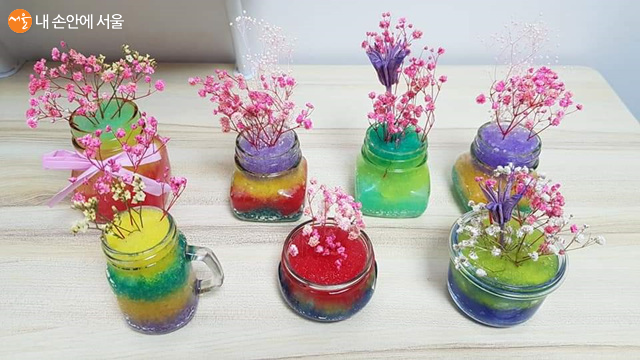 5. 점점 연해지도록 내용물을 쌓아주고 드라이플라워로 예쁘게 장식한다.