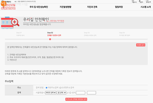 주소만 알면 서울시 지진안전포털에 접속해 간단하게 내가 사는 집의 내진성능을 확인해볼 수 있다. 주소를 입력하면 서울시 부동산정보광장과 연동해 건축물 대장 정보가 조회되고, 이어 건물의 구조형식과 증축여부를 선택해 내진설계 여부를 파악한다. 필자가 살고 있는 집은 ‘허가당시 건축법과 구조설계기준에 따라 건설되었다면 내진설계되었다’는 확인 결과를 받았다.