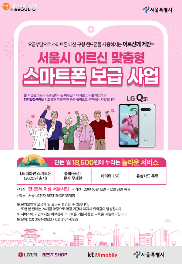 서울시는 어르신의 스마트폰 보유율을 끌어올리고 코로나19 이후 더욱 심화하고 있는 디지털 격차를 좁히기 위해서 어르신 맞춤형 스마트폰 보급에 나서고 있다. LG전자, KT엠모바일(알뜰폰 통신사), 하이프라자(유통사) 3개 기관과 협력하고 있다. 어르신 맞춤형 요금제는 서울 시내 35개소 하이프라자 직영 LG 베스트샵에서 가입할 수 있다. 가입 대상은 만 65세 이상 서울시민이고, 신청 기간은 2020년 10월 12일~12월 31일까지다.