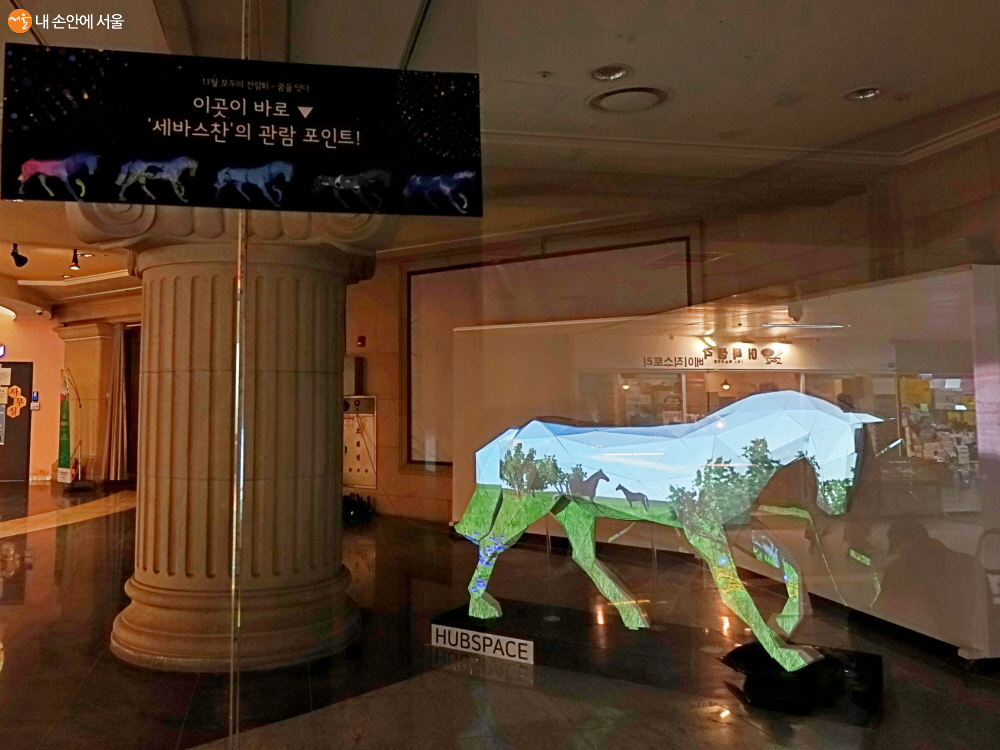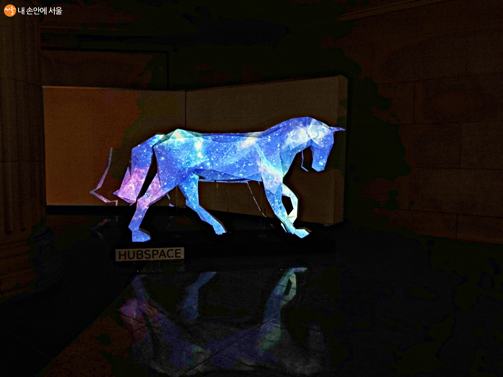 ‘HUBSPACE’는 광운대학교 미디어커뮤니케이션학부 소속 학생들로 주변의 유휴공간을 문화체험적인 공간으로 만드는 활동을 하고 있다고 한다. 코로나19 상황이 지속되는 가운데 접촉을 최소화하면서 즐길 수 있는 문화 콘텐츠를 고민하다가 미디어파사드 프로젝트를 시작하게 되었고, ‘꿈을 잇다’에는 “힐링-‘달콤한 꿈’”이라는 전시명으로 참여하고 있다. 이 팀은 말 형태의 조형물과 프로젝션 매핑을 활용한 영상 작품을 선보이고 있는데, 유리창 저 너머에 ‘세바스찬이라는 이름의 멋진 말 한 마리가 보였다.