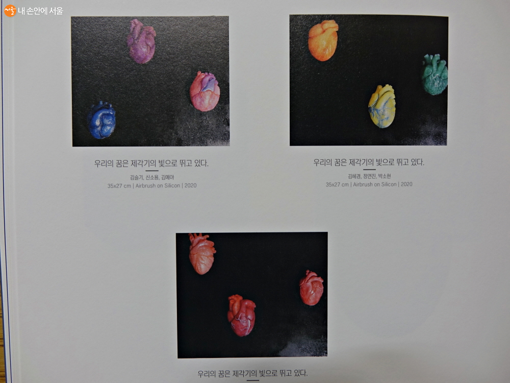 ‘우리의 꿈은 제각기의 빛으로 뛰고 있다’와 ‘Dream flow’라는 제목의 심장 모형은 진짜처럼 박동이 느껴졌다. 실제로 전자기기들의 움직임을 제어할 수 있도록 하는 장치인 아두이노를 이용해 심장이 움직이는 메카닉을 만들고, 실리콘으로 심장 모양 덮개를 뽑아낸 다음에 그걸 씌운 형태라고 한다.