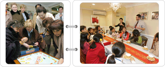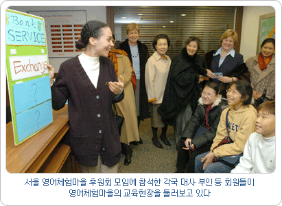 ■ 영어체험마을 발전 위한 방안 논의 여권을 가지고 출입국 관리사무소에서 입촌 수속을 밟고, 호텔 예약을 하고, 점심식사를 주문하는데, 우리말 대신 모두 영어로만 한다. 영어권 나라의 작은 마을을 옮겨 놓은 듯, 원어민 교사와 함께 생활하면서 공부할 수 있는 풍납동 ‘영어체험마을’은 지난 해 12월 7일 공식 개원행사를 가진 이래 매주 서울시 소재 초등학교 5, 6학년 학생 3백 명을 대상으로 5박 6일 영어체험마을 프로그램을 성공적으로운영하고 있다. 또한 17일에는 주한 영어권 국가 대사부인들을 중심으로 후원회 발족을 위한 첫 모임을 갖기도 했다.