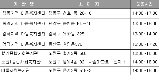 복지관 등 7곳에서 동시에 열린다. 서울시 관계자는 각 시설별로 20명 내외의 학생들이 캠프에 참여할 것으로 예상하며, 직접 외국인들로부터 기초영어를 배울 수 있는 특별한 기회가 제공된다는 의미에서 참가 학생들의 기대 또한 크다고 전했다. 서울시는 겨울방학캠프의 시범운영 결과에 따라 오는 여름방학부터는 전 지역으로 확대, 운영할 예정이다. 문의 : 서울시 여성가족정책관 청소년담당관 ☎ 6360-4586