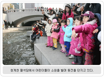 있었다. 일주일에 1~2차례씩 지금까지 총 21회에 걸쳐 수거된 동전들은 금액별로 나뉘어, 닦고 말리는 등 깨끗이 하는 과정을 거쳐 은행에 예치된다. 서울시 시설관리공단 김석종 청계천관리센터소장은 “청계천을 찾은 많은 관람객들이 던진 행운의 동전이 개인의 소망을 빌 수 있는 따뜻한 시간을 안겨줌과 동시에 어려운 이웃을 위해 쓰여 일석이조의 효과를 안겨줬다”고 설명했다. 앞으로도 행운의 동전던지기는 청계천 팔석담에서 계속되어, 꾸준히 이웃사랑을 실천해 나갈 계획이다. |