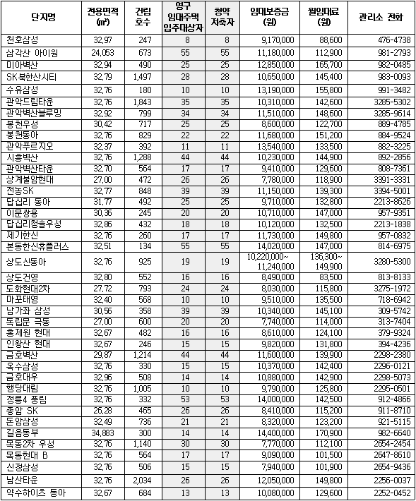 157가구와 25평형(전용면적 18평) 38가구 등 두 종류. 33평형의 경우 임대보증금은 4천450만원 안팎, 월 임대료는 57만원선이며, 25평형 임대보증금은