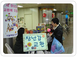 세계 놀이의 날 기념행사로 개최되는 이번 행사와 관련 서울시 관계자는 “아이들이 즐거운 놀이문화를 통해 놀이의 중요성을 이해하는 한편 장난감 교환 행사 실시로 장난감도서관에 대한 이해를 증진하도록 하기 위해 기획되었다” 고 밝혔다. 세계 놀이의 날은 한국장난감도서관 협회 김후리다 회장이 지난 2000년도에 유엔 등에 5월 28일을 세계놀이의 날로 지정하자고 제안한 이후 국제장난감도서관협회(ITLA)가 이탈리아 총회에서 “가장 올바른 아이의 성장은 안전한 환경에서 하고 싶은 놀이를 마음껏 할 수 있게 하는 것”에 인식을 함께 함으로서 이루어졌다. 한편 지하철2호선 을지로입구역내에 위치한 서울시녹색장난감도서관은 지난 2001년 12월 14일에 문을 열었다. 장난감 대여, 자녀 양육 상담, 자유놀이실 등을 운영하고 있는 서울녹색장난감도서관에는 현재 약 5천여점의 장난감이 비치되어 있다. (문의: 서울시 가족보육담당관 ☎ 02-3707-9853) | |