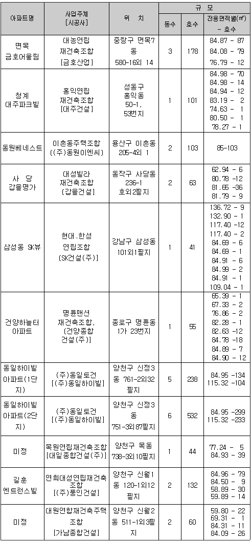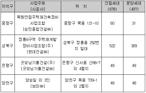 9월 29일 모집 공고, 10월 4일 청약 접수 오는 10월 4일 청약 접수 예정인 서울 제 9차 민영주택 동시분양에서 총 건립 분 679 호 중 437호를 일반 분양한다. 총 4개 사업장에서 주택을 공급하는 이번 분양에는 중랑구의 승민종합건설과 성북구의 현대건설, 은평구의 굿모닝기륭건설, 양천구의 보미(주) 등이 참여한다. 현대건설은 성북구 정릉 6구역 일대에 재개발 아파트 522 가구를 건립하며, 이 중 309 가구를 일반분양 하고, 승민종합건설은 중랑구 묵동에 건립하는 60 가구 중 31 가구를 분양한다. 또 굿모닝 기륭건설은 은평구 신사동에 건립하는 49 가구를, 보미(주)는 양천구 목동에 건립하는 48가구를 모두 일반분양 한다. 이번 분양분에는 강남권 물량은 없으며, 현대건설이 시공하는 성북구 정릉 6구역 주택재개발정비사업조합 분양분이 309가구로 규모가 가장 크다. 오는 29일부터 입주자 모집 공고를 시작하여, 10월 4일 청약 접수를 받을 예정이다. 한편, 10월 입주 예정인 아파트는 11개 단지 26개 동 1,547호다. 서울시 동시분양 자료는 서울시 주택국 홈페이지(서울동시분양)http://housing.seoul.go.kr에서도 열람할 수 있다. -문의 : 서울시 주택국 ☎ 02)3707-8214