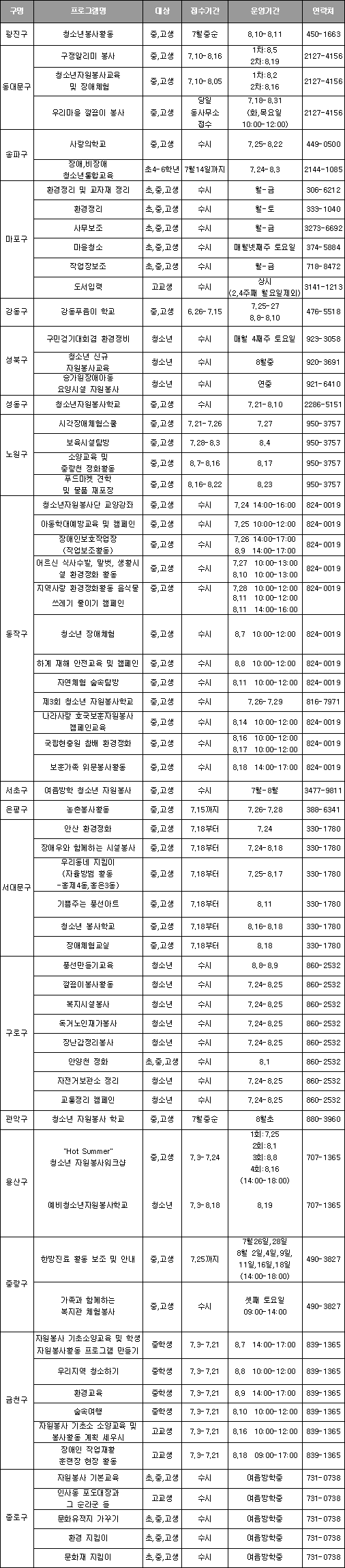 이색적인 프로그램도 눈에 띈다. 마포구는 고교생을 대상으로 '도서입력' 프로그램을 운영하고 구로구는 '장난감 정리봉사', 중랑구는 '한방진료 활동보조 및 안내'를 맡을 중·고생을 모집한다. 또 은평구의 ‘농촌봉사활동’은 농촌체험과 봉사를 동시에 할 수 있으며 서대문구는 ‘기쁨주는 풍성아트’로 만드는 재미를 선사한다. 종로구에서는 관광객들로부터 인기가 많은 ‘인사동 포도대장과 그 순라군들’을 진행해 낯설지만 즐거운