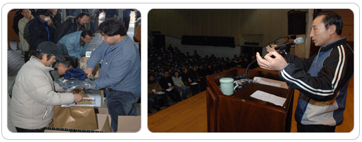 건강검진 통과한 교육대상자 600명 우선 배치…2.6부터 현장근무 시작 노숙인들이 자활 의지를 되살려 하루 빨리 사회에 복귀할 수 있도록 돕기 위해 서울시가 시행하는 ‘노숙인 일자리 갖기 프로젝트’ 가 2월 1일 시동을 걸었다. 서울시는 건강검진을 통과한 프로젝트 참여 대상자 1,072명을 대상으로 2월 1일 용산구민회관에서 사전교육을 실시했다. 이날 사전교육에는 건강검진 결과 취업 보류등급(D) 판정을 받은 70명을 제외한, 정상등급(A)의 310명과 약간의 주의를 요하는 등급(B)의 482명, 경노무가 가능하나 치료가 필요한 등급(C) 280명 등 총 1,072명이 참석했다. 4일까지 계속되는 사전교육 중 첫날은 이명박 서울시장의 특강을 시작으로, 김진홍 목사의 특강과, 노숙생활을 접고 사회인으로 복귀한 이상돈(한양전산직업전문학교 근무)씨의 사례 발표가 이어졌다.