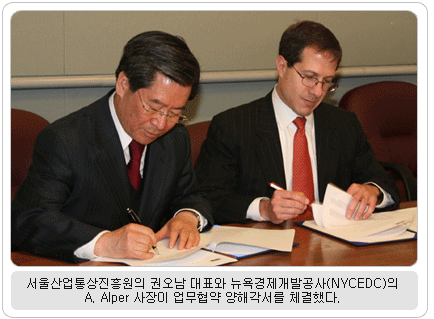 패션, 예술, 영화, 디지털 컨텐츠 등 지식과 경험 공유하고, 기업간 상호 교류 적극 지원키로 뉴욕으로 이동한 이명박 서울시장은 3월 15일(수) 오전 10시(한국시각 3.16 자정) 뉴욕시청을 방문, 마이클 블룸버그 뉴욕시장과 만나 서울과 뉴욕 간 교류 협력 증진 방안 및 경제 협력 방안에 대해 논의하였다. 현대건설 회장 출신의 이명박 시장은 블룸버그통신 회장 출신인 블룸버그 시장과 경제 분야의 현안에 대해 깊이 있는 대화를 나누었으며, 대도시가 당면하고 있는 도시문제의 해결방안에 대해서도 폭넓게 의견을 교환하였다. 이 자리에는 서울시와 뉴욕시의 기업 활동 지원을 맡고 있는 서울산업통상진흥원의 권오남 대표와 뉴욕경제개발공사(NYCEDC)의 A. Alper 사장이 배석하였으며, 오전 11시 뉴욕경제개발공사에서 업무협약을 위한 양해각서를 체결하였다. 양해각서에 따르면, 양 기관은 ▶ 패션, 예술, 영화, 디지털 컨텐츠 등의 분야에서 상호 경험과 지식을 공유하고 ▶ 상호 관심 기업에 대한 비즈니스 정보를 공유 및 지원하며 ▶ 상호 경제 개발 정책이나 계획에 대한 인식 확대를 위한 지원 및 독려 등 협력 관계를 맺게 된다.