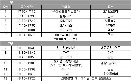 23개 동아리 360명의 공연과 전시 선보여 23개 동아리의 다양한 공연과 전시가 선보일 이날 행사에는 레크레이션 강사 고경환씨가 사회자로 초청되었으며, 청소년들이 좋아하는 팝핀댄스(Poppin Dance, 스트리트댄스의 한 종류)팀인 Animation Crew가 출연해 축제의 열기를 한층 고조시킬 예정이다. 경복여자정보산업고 연극반 해밀의 “B사감과 러브레터”, 재한몽골학교 솔롱고스의 연극 “무지개”, 일신여자상업고 아니마의 응원댄스, 명지중 웃도드리의 사물놀이연주, 서울공업고 세라믹아트의 도예작품 전시 등 모든 프로그램에는 청소년들의 지난 1년간 노력과 열정이 담겨있다. 무대 앞에 서는 것만으로도 행복하고 가슴 설렌다는 벤처단원들은 이번 축제를 위해 주말마다 밤늦도록 연습에 매진했다. “청소년문화벤처단 페스티벌-무한열정! 무한감동!”은 무료로 관람할 수 있으며, 공연 시작 30분부터 선착순 입장한다. ■ 문의 : ☎ 02-3290-7130, www.sfac.or.kr