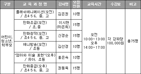 ■ 교육기간 ○ 2차 : 2007. 1. 15(월) ~ 1. 26(금) / 하루3시간(총10강) - 모집기간 : 2006. 12. 4(월) ~ 2007. 1. 14(일) - 오전반 : 10:00 ~ 13:00, 오후반 14:00 ~ 17:00 - 강 좌 : 만화초급, 만화창작, 애니방송, 플래쉬, ‘엄마와 미술 표현’등 ■ 대 상 : 초 · 중 · 고, 학부모 ■ 모집인원 : 만화초급, 만화중급, 드로잉, 플래쉬, 3D애니메이션 등(75명) ※온라인 선착순 모집(회원가입) ■ 수 강 료 : 각 강좌 당 100,000원 ■ 결제방법 ○ 무 통장 계좌입금 : 회원가입 후 신청서 작성 전화로 등록 확인 후 계좌입금 ○ 카드결제 : 회원가입 후 신청서 작성 후에 바로 카드결제 가능 ※ 결재 후, 반드시 담당자와 유선으로 확인하시기 바랍니다. ■ 문의전화 : ☎ 02-3455-8357, 8376, 8354 ※ 주의 사항 - 접수 후 필히 담당자와 통화 등록 확인 후 입금(입금자명 확인) - 담당자 에게 입금 계좌 문의 - 수업 개시 후 환불 불가 - 수업 시작 전 문자 메시지 통보 및 홈페이지 공지사항 참조