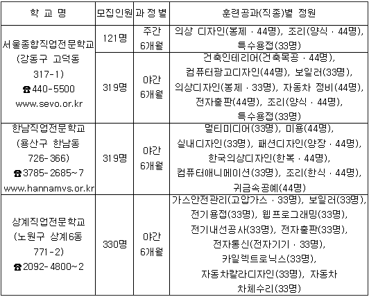 7월10일~8월18일, 1천89명의 교육생 모집 갈수록 좁아지는 취업의 문. 그리고 그에 반해 늘어나는 실업문제 해소를 위해 서울시가 적극 나서고 있는 가운데 최근 직업학교에서 운영하는 교육이 수강생들의 호응을 받고 있다. 전문기술분야의 구직자들은 서울시가 운영하는 현장위주의 무료교육을 통해 지혜롭게 실업의 늪을 탈출해 보자. 서울시는 오늘부터 8월18일까지 서울시립직업전문학교 시민직업교육훈련생을 모집한다. 직업학교는 강동구 고덕동에 소재하는 서울종합직업전문학교, 용산구 한남동 소재 한남직업전문학교, 노원구 상계동 소재 상계직업전문학교 등 3곳으로 모두 1천 89명의 교육생을 모집한다. 직종분야는 의상 디자인, 한식ㆍ양식 등의 조리, 특수용접, 컴퓨터광고 디자인, 멀티미디어, 미용, 자동차 정비, 전자통신 등 다양하다. 교육기간은 9월1일부터 내년 2월28일까지로 6개월이며 교육을 수료하면 병역 연기 가능, 취업 알선,