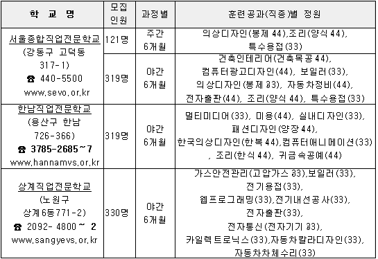 8월18일까지 35개 직종 1천89명 모집 갈수록 좁아지는 취업문을 통과하기 위한 구직자들의 노력이 눈물겹다. 그러나 바쁠수록 돌아가라는 말이 있듯 전문기술분야의 구직자들은 서울시립직업전문학교가 운영하는 현장위주의 무료교육을 통해 지혜롭게 실업의 늪을 탈출해 보자. 서울시는 8월18일까지 서울시립직업전문학교 시민직업교육훈련생을 모집한다. 이번에 1천 89명의 교육생을 모집하는 직업학교는 강동구 고덕동 소재 서울종합직업전문학교, 용산구 한남동의 한남직업전문학교, 노원구 상계동의 상계직업전문학교 등 3곳이다. 직종분야는 의상 디자인, 한식ㆍ양식 등의 조리, 특수용접, 컴퓨터광고 디자인, 멀티미디어, 미용, 자동차 정비, 전자통신, 건축인테리어, 웹 프로그래밍 등 35개 직종 65개 공과로 다양하다. 교육기간은 9월1일부터 내년 2월28일까지로 6개월이며 교육을 수료하면 병역 연기 가능, 취업 알선, 창업자금융자지원 등의 혜택이 주어진다. 게다가 수강료, 교재비, 실습비, 기능검정료 등 교육훈련비 전액은 무료이다. 지원자격은 현재 서울시에 주민등록이 되어 있는 만15세 이상 55세 이하의 서울시민이면 되며 원서교부는 응시학교 교무과, 구청 취업정보은행, 주민자치센터 등에서 하고 있다. 접수는 응시하고자 하는 학교로 직접 하면 된다. 구비서류는 응시원서, 사진(3x4) 2매, 주민등록원초본 1통, 국민기초생활보장법에 의한 수급자, 모ㆍ부자보호대상자, 국가유공자 중 취업보호대상자, 5.18민주유공자 등은 증빙서류 첨부, 24세 이하의 비진학 청소년은 최종학력증명서, 실업자는 구직등록증 등을 제출하면 된다. 한편 서울시는 직업훈련을 받고 싶어도 당장 생계마련이 어려운 저소득 시민을 대상으로 훈련기간 동안 생계보조비 15만원과 교통비 5만원 등 월 20만원을 지급하기로 했다. 훈련수당 지급 대상자는 시립직업전문학교에 입학하는 국민기초생활보장 수급권자, 모ㆍ부자복지법에 의한 보호대상자, 국가유공자 등 예우 및 지원에 관한 법률에 의한 취업보호대상자, 사회복지시설거주자, 5ㆍ18민주유공자로서 고용법에 의한 실업급여 자격이 없으면서 주간과정에 참여하는 자이다. 이와 관련 서울시 고용대책과 관계자는 “이번에 모집하는 교육생의 훈련 직종은 서울형신산업 분야가 많으므로 생계가 어려운 저소득 시민들이 많이 신청하기를 바란다”고 밝혔다. (문의: 서울시 고용대책과 ☎02-3707-9373~4, 서울종합직업전문학교 ☎02-440-5500, 한남직업전문학교 ☎02-3785-2685, 상계직업전문학교 ☎02-2092-4800)
