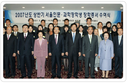 인문분야 179명, 과학분야 183명 등 선발 미래의 한국을 이끌어 나갈 젊은 인재들의 앞길이 한층 밝아질 전망이다. 서울시는 모든 학문과 산업의 기반이 되는 인문학 및 기초과학을 육성하기 위해 대학의 이공계 및 인문학분야 박사과정생을 대상으로 장학생을 선발하고, 5일 오후 2시 세종문회화관 세종홀에서 장학증서 수여식을 가졌다. 장학증서 수여식에는 오세훈 서울시장을 비롯해 서강대 손병두 총장, 서울시립대 이상범 총장, 숙명여대 이경숙 총장, 이화여대 이배용 총장, 한국외대 박철 총장, 한양대 김종량 총장이 참석해 자리를 빛냈다. 오세훈 서울시장은 장학생들에게 하나하나 증서를 수여하며 “국가경영에 있어서 인재확보의 중요성이 세계적으로 널리 부각되고 있다”며, “사명감을 갖고 학업과 연구에 전념해 원대한 꿈을 성취하고, 서울과 대한민국 발전의 밑거름이 되기를 바란다”며 격려했다. 서울 인문·과학장학생 선발사업은 기초인문학 및 핵심기초과학 연구인력을 지원하는 사업으로, 서울시는 매년 60여억원을 투입해 연간 800여명에게 500~600만원의 장학금을 2년간 지급하고 있다. 지방자치단체 최초로 2005년 서울과학장학생 311명을 선발한 것으로 출발해, 2006년에는 범위를 인문학까지 확대해 과학장학생 304명과 인문장학생 300명을 선발했고 올해 상반기에는 과학분야 183명, 인문분야 179명 등 총 364명을 선발했다. 또 서울과학장학금을 받는 동안 학문에 전념하여 세계적인 과학잡지에 게재되는 등 특별한 공적이 있는 학생에게는 300~500만원의 특별장학금이 지급되는데, 이번에는 ‘Applied Physics Letters’지에 논문이 게재된 연세대학교 이홍석 학생과 ‘Molecular Cell’지에 논문이 게재된 서울대학교 노재석 학생이 선발되어, 각각 300만원을 수여받았다.