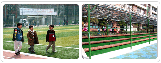 흙먼지 날리던 학교 운동장이 쾌적한 생활 체육 공간으로 탈바꿈하고 있다. 서울시 한 구청에서 진행하고 있는 ‘학교 잔디 운동장 조성사업’의 결과이다. 초록빛의 인조 잔디 운동장 작업을 완료한 한 초등학교를 찾아보았다. 서초구 반포동의 서원초등학교 운동장은 5억4천여만원의 사업비를 투자해 길이 77미터, 너비 38미터 규모의 새로운 운동장으로 탄생했다. 본관 건물 앞의 3단 관람석도 친환경 재질인 나무로 새롭게 꾸몄다. 수업시간에는 어린이들에게 훌륭한 교육공간으로, 방과 후에는 지역 주민들에게 개방될 워킹 코스도 구에서 무료로 깔아주었다. 걷기 운동을 통해 주민들의 건강한 생활을 돕게 될 워킹 코스는 그동안 초ㆍ중ㆍ고 25여개의 학교에 설치되어 좋은 반응을 얻고 있다고 한다. 구청에 따르면 지금까지 인조 잔디 운동장이 조성된 곳은 이곳을 비롯, 총 9개교에 이르며, 오는 7월까지 구내 4개 초등학교를 추가로 조성할 예정이라고 한다.