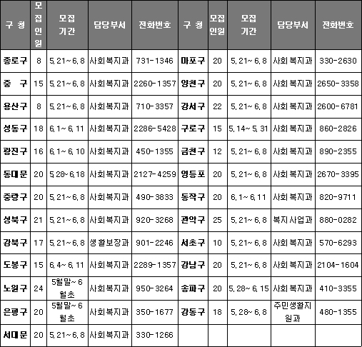 행정업무 보조할 장애인 행정도우미 모집 서울시 25개 자치구는 주민자치센터(동사무소)에서 행정업무를 보조할 장애인 행정도우미를 자치구별로 모집한다. 사회복지담당 보조 인력으로, 자료정리 등의 행정업무를 맡게 된다. 서울시 전체 총 444명을 모집하는 장애인 행정도우미의 응모기간은 6월 초순까지이다. 신청서는 서울시 장애인종합홈페이지(friend.seoul.go.kr)에서 정보광장-자료실을 클릭하면 다운받을 수 있고, 각 자치구별로 정해진 날짜에 장애인 복지담당 관련부서에 신청하면 된다. 응모자격은 서울시 등록 장애인으로 보조인 없이 담당 업무수행이 가능한 저소득 장애인이다. 근무기간은 7월~12월까지 6개월간이며, 주민자치센터(동사무소)에서 오전9시부터~오후6시까지 공무원과 동일하게 근무한다. 보수는 월 70만원 정도이며, 의료보험 등 4대 사회보험에 가입된다. 관련문의는 거주지 구청 사회복지과(장애인 담당부서)로 하면 된다.
