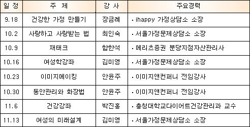 9월18일부터 11월13일까지 총 8회 운영 잠실종합운동장에서 이달 18일부터 여성을 위한 강좌를 운영한다. 서울시체육시설관리사업소는 18일부터 11월13일까지 총 8회에 걸쳐 ‘제1기 여성이 행복한 아카데미’를 개설, 운영한다. 잠실종합운동장 올림픽전시관에서 매주 화요일 오후 2시부터 실시되는 강좌는 각 분야의 전문가가 강사로 나서 건강한 가정 만들기, 사랑하고 사랑받는 법, 재테크, 동안관리와 화장법, 여성의 미래설계 등 여성이 필요로 하고 관심 있는 분야를 선정, 진행할 계획이다. 서울에 살고 있는 여성이면 누구나 참가 가능하며 희망자는 전화 및 방문하여 접수하면 된다. 1백명 선착순 모집이며 참가비는 1만원이다. 강좌 운영과 관련 서울시체육시설관리사업소 관계자는 “아카데미는 서울시에서 추진 중인 여성이 행복한 도시 프로젝트 사업의 일환으로 진행되는 프로그램이므로 여성들에게 실질적이고 유익한 강좌를 제공할 방침”이라고 밝혔다.