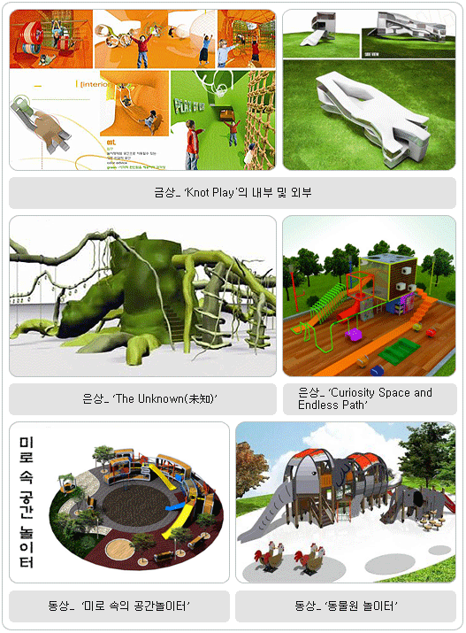 건국대 시민준ㆍ박지원의 ‘Knot play’ 금상 수상 모래 위 미끄럼틀과 녹슨 그네, 삐걱거리는 시소가 차지하고 있던 놀이터 대신 알록달록 색색의 매듭, 거대한 코끼리와 미로가 들어섰다. 놀이터가 이쯤 된다면 아이들의 상상력과 꿈도 쑥쑥 자라나지 않을까. 서울문화재단은 천편일률적인 동네 놀이터를 창의적이고 예술적인 문화놀이터로 바꾸어 나가고자 지난 8월 16일부터 22일까지 <제3회 문화가 있는 놀이터 모델 디자인 공모> 작품을 접수하고, 그 결과를 발표했다. 영예의 금상을 차지한 ‘Knot Play'(건국대학교 실내디자인학과, 시민준ㆍ박지원)는 매듭이 묶여나가는 과정을 실내 놀이터 디자인에 응용한 참신한 아이디어가 돋보이는 건축물 컨셉 디자인이다. 은상은 비구조화된 시설물과 자연환경의 조화를 시도한 ‘Curiosity Space and Endless Path'(홍익대학교 건축공학부, 성백홍ㆍ김상은)와 아이들을 미지의 숲속 세계로 인도하는 ‘the Unknown(未知)’(덕성여자대학교 실내디자인학과, 김미연)이 수상했다. 동상은 코끼리를 닮은 놀이기구를 표현한 ‘동물원 놀이터’(ARDION, 오승재ㆍ이준호)와 각 놀이기구를 미로로 연결한 ‘미로 속의 공간놀이터’(서울시립대학교 건축학부, 박은주ㆍ임세인)가 수상했다.