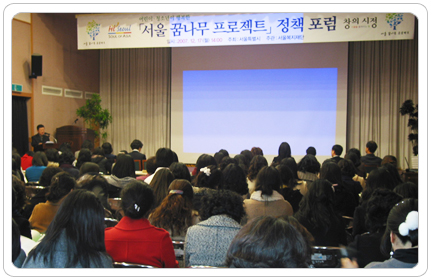17일 ‘서울꿈나무 프로젝트’ 정책포럼 개최 한편 서울시는 설문조사결과를 바탕으로 지난 17일 서울시청 별관 1동 대강당에서 현실성 있고 실천 가능한 서비스제공방안과 정책 방향을 설정하는 ‘서울꿈나무 프로젝트’ 정책포럼을 개최하였다. 아동·청소년복지 관련 전문가, 관계 공무원, 아동·청소년시설 관계자 등 300여명이 참석한 가운데 개최된 이날 포럼에는 이은주 동국대 교수가 아동의 실태에 대한 조사분석자료를 발표한데 이어 숙명여자대학교 이재연 교수가 ‘서울 꿈나무 프로젝트의 모델’주제 발표를 하였다. ■ 문의: 서울시 청소년담당관 ☎ 02-6360-4587 |