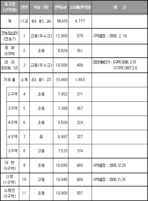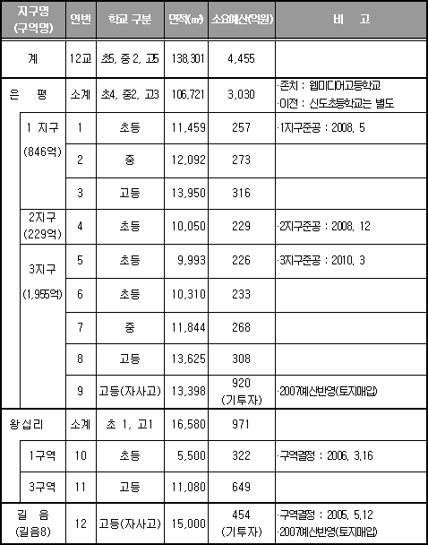 입주 시기에 맞춰 개교하는 등 교육환경 개선 뉴타운 지구에 자립형사립고 2개교를 비롯 23개교의 초, 중, 고등학교가 신설된다. 또 뉴타운 지구의 기반시설을 확충, 주거환경이 한 단계 상승되는가 하면 뉴타운 사업관련 공람정보도 전화문자메세지전송(SMS)으로 제공되는 등 뉴타운 관련 서비스가 시민고객위주로 대폭 개선된다. 서울시는 28일 은평, 길음, 왕십리 등 시범 뉴타운 및 동대문구 전농, 답십리 2차 뉴타운 지구에 23개의 학교를 신설, 입주민의 불편을 최소화 하겠다고 밝혔다. 서울시에 따르면 은평뉴타운 지역에 초등학교 4개, 중학교 2개, 자립형 사립고를 포함한 고등학교 3개교가 신설되고, 왕십리뉴타운에 초등학교 1개, 고등학교 1개, 길음에 자립형사립고 1개교 등 12개교가 들어선다. 2차 뉴타운지구인 가재울에도 초등학교 3개, 중,고등학교 각 1개 등 5개교가 신설되고 전농 답십리지구와 미아지구, 신정지구에 고등학교 각 1개교씩 들어선다. 또 중화지구, 아현지구, 노량진지구에 초등학교 각 1개교 등 11개교가 신설된다. 23개의 학교신설에 소요될 것으로 추정되는 9천2백32억원의 비용 가운데 서울시가 5천755억원, 서울시교육청이 3천477억원을 부담하게 된다. 이에 앞서 서울시는 은평 및 길음 뉴타운지구의 자립형 사립고 용지매입을 위해 올 예산으로 1천3백74억원을 확보해 놓은 상태다. 또 2008년 5월 입주하는 은평뉴타운 1지구의 학교 개교와 관련 초, 중, 고 등 3개교의 용지 매입비 8백46억원 가운데 서울시와 교육청이 각 반씩 부담할 수 있도록 올해 추경에 확보할 방침이다. 한편 현재 재정비촉진계획 수립중인 3차 뉴타운 10개 지구도 교육청과 협의하여 부족한 학교를 신설, 시민들의 입주에 차질이 없도록 할 계획이다.