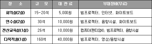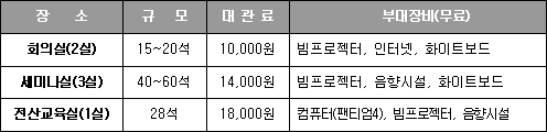 회의실, 세미나실, 연수실, 전산교육실, 다목적홀 등 제공 서울산업통상진흥원(http://sba.seoul.kr)의 서울벤처타운(강남 역삼동)과 서울신기술창업센터(강서구 등촌동)에서는 중소기업들의 비즈니스 지원을 위해 다양한 부대시설을 시세 보다 저렴하게 제공하고 있다. 회의실, 세미나실, 연수실, 전산교육실, 다목적홀 등을 이용할 수 있으며, 인터넷, 빔프로젝트, 컴퓨터, 음향시설 등 부대장비는 무료로 사용 가능하다. 특히, 벤처타운의 경우 공용장비센터에 최신 HD영상녹화장비와 디지털컨텐츠 제작에 필요한 영상 및 음향편집 장비까지 갖추고 있다. 신기술창업센터 내의 시설사용료는 20석 규모 회의실의 경우 시간당 5천원, 160석 규모의 다목적홀은 시간당 4만원이고, 벤처타운 내 시설 사용료는 40-60석 규모의 세미나실은 시간당 1만원, 28석 규모의 전산교육실은 시간당 1만8천원이다. 창업센터에서는 시설 이용자에게 센터 내에 설치되어 있는 정보자료실, 구내식당, 탁구장, 체력단련실, 샤워실, 사우나실 등 부대시설도 무료로 사용할 수 있도록 제공한다. ■ 문의 서울신기술창업센터(강서구 등촌동) : ☎ 02-2657-5723~6.