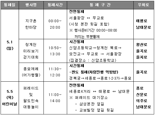 5월5일 어린이날에 있을 ‘퍼레이드 및 팔도민속 대동놀이’에 세종로, 태평로의 교통이 전면통제될
