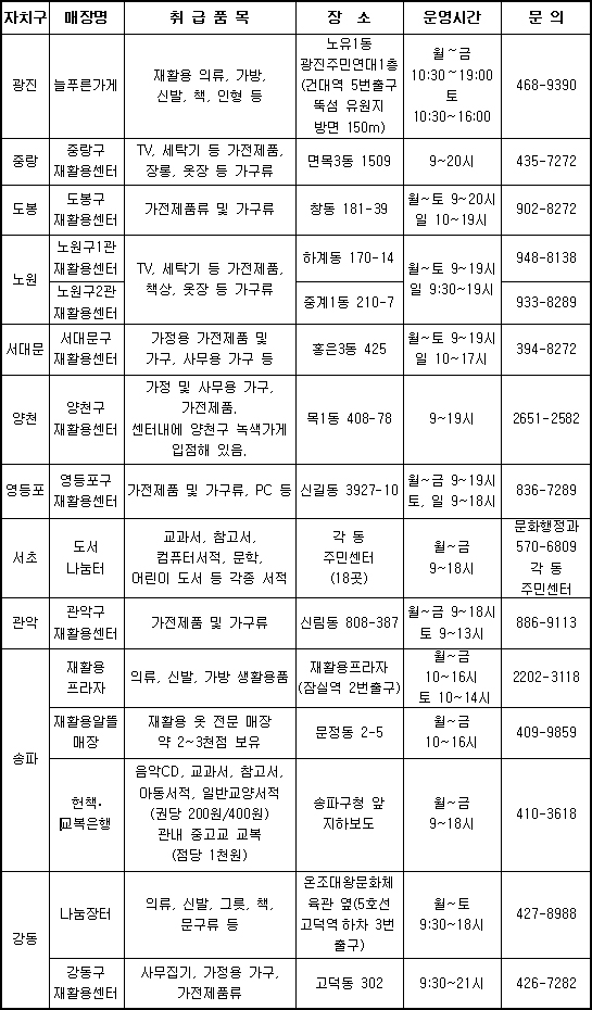 가전제품 6개월 무상 A/S, 교복 한 벌에 4천원 광진구 노유1동에 위치한 ‘늘푸른가게’에선 천연세제나 환경수세미 등 친환경 제품을 구매할 수 있고, 회원이나 주민들이 우리 유기농 농산물도 구매할 수 있다. 또, 사용하지 않는 물품을 기증받아 말끔히 정리해 새것 같이 팔고 있다. 의류, 가방, 신발, 책 등 주민이 안 쓰는 물건이나 또는 관내 업체가 내놓은 기증품들은 5천원 이하의 가격에 구매할 수 있다. 판매로 얻은 수익금은 관내 어려운 학생의 학비나 어려운 주민의 생활비로 지원한다. 중랑구의 ‘재활용센터’에선 학생용 의자, 책상을 비롯해 소파, 대형 와이브로 TV까지 다양한 가전제품과 가정용ㆍ사무용 가구 등을 구비하고 판매하고 있다. 가격은 사용기간이나 상태에 따라 다양해 직접 방문하여 확인 후 구매해야 한다. 양천구 목1동에 위치한 ‘양천구 재활용센터’에선 일반가전제품, 가정용ㆍ사무용 가구 등을 취급하고, 수요가 많이 줄긴 했지만 PC와 모니터도 취급하고 있다. 또 센터 내에 양천구 녹색가게 1호점이 입점해 있어 옷, 신발, 가방, 도서 등 생활용품을 교환하거나 살 수 있어 선택의 폭이 넓다. 서초구는 동 주민센터에 작은 도서관인 ‘책 사랑방’을 운영하고 있는데, 도서를 빌려 보는 것 외에 ‘도서 나눔터’도 마련하여 운영한다. 새학기가 시작되면서 필요없게 된 교과서, 참고서, 컴퓨터 서적, 문학서적이나 어린이 도서 등 다양한 종류의 서적을 주민이 기증하고 또 필요한 사람은 자율적으로 가져갈 수 있도록 운영하고 있다. 송파구청 앞 지하보도에 위치한 ‘헌책ㆍ교복은행’에선 교과서, 참고서, 아동도서, 일반교양도서 등 각종 서적이 주류를 이룬다. 아동도서의 경우 권당 200원, 일반 교양도서의 경우 400원에 판매된다. 서적 외에 송파구 관내 중ㆍ고등학교 교복도 점당 1천원씩에 판매되고 있어 교복 한 벌을 4천원에 구입할 수도 있다.