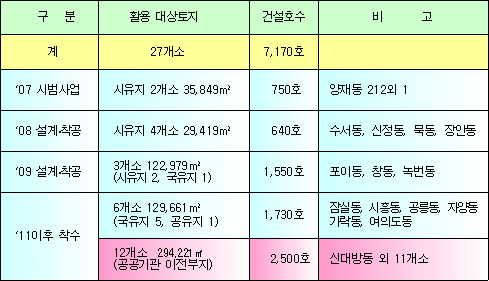 ) 선포식에서 오세훈 서울시장이 밝힌 장기전세주택 공급 확대계획의 일환으로, 27개소 612,129㎡에 7천170호의 장기전세주택을 건설해 무주택 시민·중산층에게 공급할 계획이다. 서울시 김효수 주택국장은 “기존의 택지개발 위주의 공급에서 나아가 서민들이 대중교통을 쉽게 이용할 수 있도록 역세권 주변에 장기전세주택을 공급할 필요성이 있다”고 설명했다.