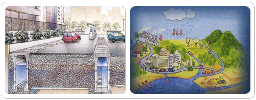집중호우 대비 및 자원으로 재활용 서울시는 최근 이상기상에 따른 집중호우에 대비하고 빗물을 자원으로 활용할 수 있는 방안을 마련하기 위해, 빗물 일시저장시설을 확대 설치한다. 빗물 일시저장시설은, 집중호우 시 빗물을 하천으로 직접 흘려보내지 않고 모아 두었다가 청소용수 등으로 재활용하거나, 비가 그친 후 하천 수위가 낮아진 뒤 흘려보내는 방법으로, 저지대 침수를 예방하고 지하수 자원을 확보하는 데에 매우 효과적인 방안이 되고 있다. 이 시설을 처음 설치한 지역은 중랑구 망우산 공원묘지 체육공원 지하. 이에 서울시는, 집중호우 시 청계천의 홍수량을 저감하여, 침수 피해를 예방하고자 중학천 상류, 남산 숭의여대 뒤, 성북천 상류 등 3군데에 저류시설을 설치할 계획이며, 향후 침수가 우려되는 지역을 우선 대상으로 하여 2006년부터 단계별로 저류시설 건설사업을 확대 추진할 계획이다. 또한 저류시설 외에도 빗물을 지하로 흘려보내 지하수 자원을 보전할 수 있는 친환경적 수해 예방 대책도 계획 중이다.