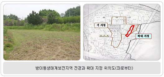 방이동생태보전지역 주변 962평 생태계보전지역으로 추가 지정 서울시는 이와 함께 지난 2002년 지정된 방이동 생태계보전지역(1만6천50여평) 주변 962평을 생태계보전지역으로 추가 지정할 계획이다. 이로써 방이동 생태계보전지역은 1만7천820여평으로 늘어나게 된다. 한편 서울시 생태계보전지역으로 지정되면 야생 동·식물의 포획, 이식 훼손하거나 하천, 호소 등의 구조 변경, 토석 채취, 수면매립 또는 불을 놓는 행위 등 생태계 보전에 해를 미칠 수 있는 각종 행위가 금지된다. 현재 서울시는 생물다양성이 풍부한 습지 등 보전가치가 높은 지역인 한강 밤섬, 둔촌동 습지, 탄천, 방이동 습지, 암사동 습지, 진관내동 습지, 고덕동 습지, 청계산 원터골 낙엽활엽수군집 등 8곳을 생태계보전지역으로 지정, 관리하고 있다. |