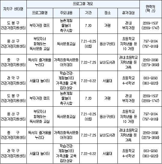 여름방학 프로그램 운영 여름방학 기간 동안 서울시 자치구 건강가정지원센터에서 운영하는 가족캠프 및 문화프로그램에 관심을 가져보자. 영등포구 건강가정지원센터는 강원도 영월에서 2박3일간 ‘여름 가족자원봉사 캠프’를 운영한다. 공부방 페인트칠하기, 지역마을 도배 및 장판 깔아주기, 지역주민과 함께 캠프, 레프팅 등을 체험할 수 있다. 용산구 건강가정지원센터에서는 3세대가 함께 모여 레크리에이션, 가족 기능성 증진 교육, 가족역사서 팝업북 만들기 등을 통해 세대간 서로 이해하는 시간을 마련하고, 중구 건강가정지원센터는 ‘삼성생명과 함께하는 청소년 여름 봉사 캠프’로, 충북제천에서 전통문화 체험 학교와 산골바람개비마을, 청풍리조트 등에서 2박3일 동안 프로그램을 진행한다. 강남구 건강가정지원센터는 ‘청소년 자원봉사 학교’를 열어 다문화 캠페인 활동을 실시하고, 송파구는 아버지와 함께 프로야구를 관람하는 ‘우리 아빠가 제일 좋아요’, 관악구는 ‘서울대 놀이터’, 성동구는 ‘가족이 함께하는 다도체험’, 용산구는 ‘부모자녀 함께하는 독서문화 교실’ 등 가족의 공감시간을 채울 수 있는 다양한 프로그램이 진행된다. 참가신청은 각 자치구 건강가정지원센터별로 실시하고 있다.