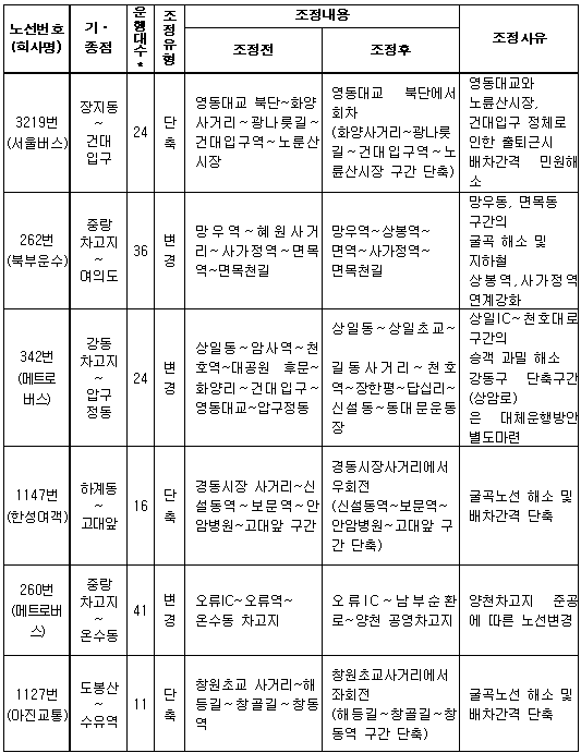 매년 네 차례 정기 노선조정 서울시가 노선변경으로 인한 시민들의 혼란과 불편을 줄이기 위해 새해부터는 노선조정을 정기시행하기로