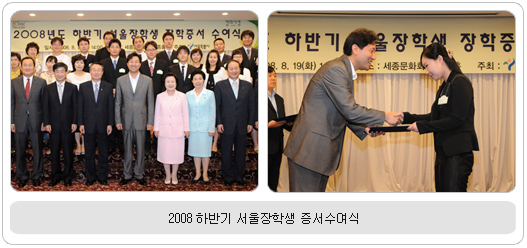 서울시는 서울 소재 대학의 박사과정생 246명을 서울장학생으로 선발하고 19일 오후 세종홀에서 이들에게 장학증서를 수여했다. 서울장학생 선발 사업은 서울시가 기초과학 및 인문학 핵심인력 양성을 통해 서울의 미래 산업 육성 토대를 마련하기 위해 매년 600여명을 선발하여 장학금을 지급하는 사업으로 이번 장학생들은 지난 6월 2일부터 20일까지 신청을 받아 1차 서류와 2차 면접심사를 거쳐 과학분야 122명과 인문학분야 121명, 특별장학생 3명 등 총246명을 최종 선발했다. 선발된 과학장학생에게는 연간 600만원씩 2년간 1,200만원, 인문장학생은 연간 500만원씩 2년간 1,000만원의 장학금이 지급된다. 문의 경쟁력강화본부 기업지원담당관 (☎ 6321-4017) 하이서울뉴스/변효진 |