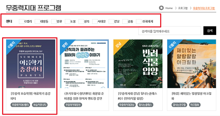 1. 자기가 거주하고 있는 지역의 무중력지대 센터를 홈페이지 상단에서 클릭한다.