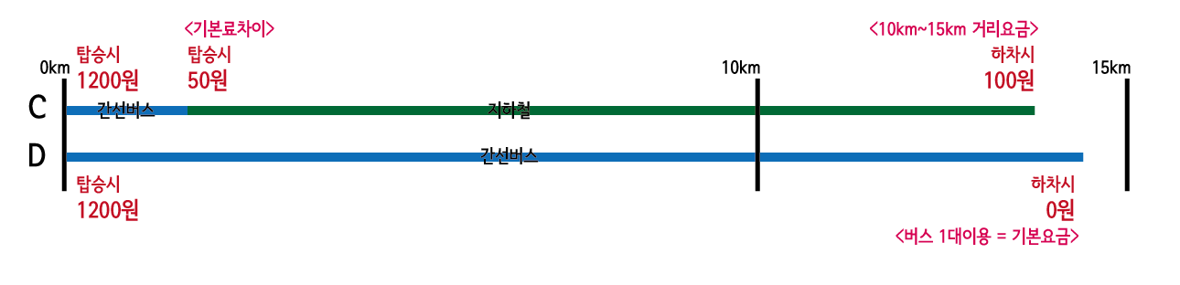 시민D의 경우 버스 한대만 이용했기 때문에 똑같이 10~15km를 이용한 시민C보다는 적은 돈을 지불한 것이다.