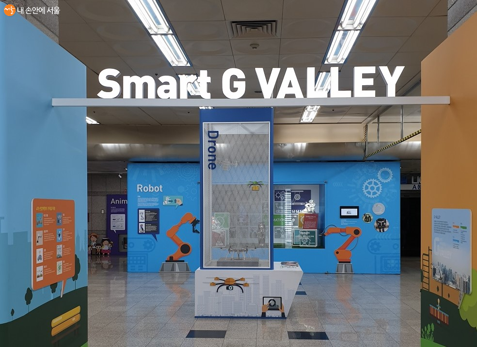 G밸리가 위치한 가산디지털단지역은 특별히 G밸리역이라고도 불리는데 역 안에는 이 지역의 특성을 설명하듯 특별한 전시 공간이 마련되어 있다. 시민들에게 낯선 4차산업 관련 콘텐츠를 직접 보고 체험할 수 있는 공간을 조성한 것. G밸리 입주기업과 함께 조성된 4차산업 콘텐츠 전시 공간은 누구나 쉽게 4차산업에 관한 개념을 익히고 체험할 수 있도록 구성해 놓았다.