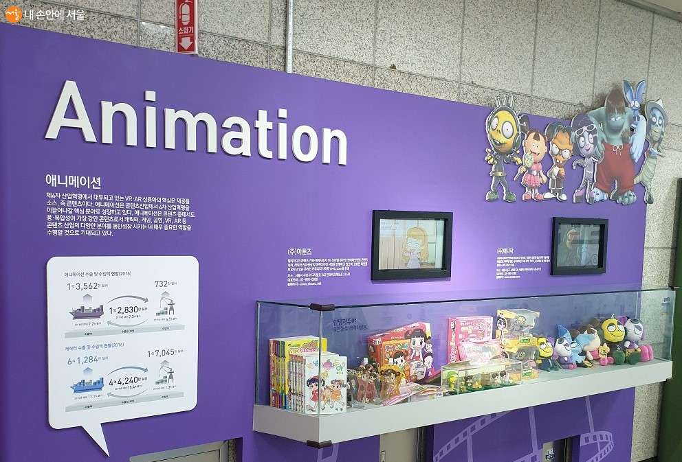 애니메이션 산업에 관해 소개하는 전시물로, 이곳 'G밸리'에 아툰즈, 애니작과 같은 다양한 국산 애니메이션 기업들도 입주해 있다는 사실을 알 수 있다. 순서에 따라 천천히 전시물을 읽고 느끼다 보면 다양한 첨단 기술과 애니메이션이 만난다면 큰 시너지를 낼 수 있다는 생각이 절로 미치게 된다.