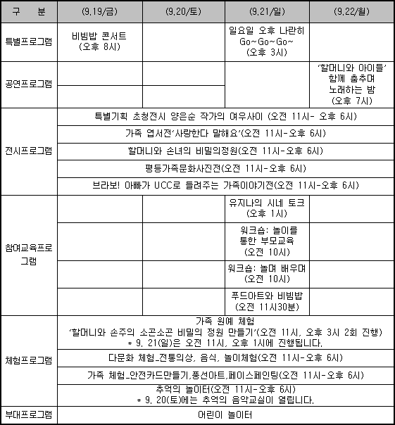 비빔밥 콘서트 등 다양한 공연, 전시, 체험, 참여 프로그램 풍성 세대를 뛰어 넘어 가족 구성원들이 활발하게 소통하는 세대 공감의 시간도 마련된다. 19일부터 21일까지 총 6회에 걸쳐 열리는 ‘할머니와 손주의 소곤소곤 비밀의 정원 만들기’는 가족이 함께 머리를 맞대 미니정원을 만들어 보는 체험의 시간으로, 3대가 함께하면서 민주적 가족관계를 생각해 보는 계기가 될 것으로 기대된다. 행사 마지막 날인 22일 저녁 7시부터는 65세 이상 할머니들이 손자, 손녀들에게 춤과 노래를 가르쳐 주는 ‘할머니와 아이들 : 함께 춤추며 노래하는 밤’도 열린다. 21일 오전 10시에는 가족 내 중심 관계라 할 수 있는 부모-자녀 세대가 놀이체험과 음악으로 서로의 마음을 읽어볼 수 있는 ‘부모·자녀 의사소통 워크숍’이 개최된다. 유아나 초등생 자녀가 있는 가족이 참여할 수 있으며 가족이 함께하는 맛있는 푸드아트도 즐길 수 있다. 영화를 통해 부부관계를 새롭게 돌아보는 이색 프로그램도 있다. 21일 오후 1시에 열리는 ‘유지나의 씨네토크 : 좋은家, 나쁜家, 행복한家’는 늘 함께하면서도 서로 돌아볼 수 없었던 부부나 예비 부부 등이 참여해 영화의 주요 장면들을 감상하며 솔직담백한 이야기를 나눠보는 시간. 특히 이날은 영화배우 권해효씨가 함께 출연해 영화와 가족에 대한 이야기를 소탈하게 나눌 예정이다. 모든 프로그램 무료, 인터넷 사전 신청 후 참여 가능 여자이야기 전시 ‘여.우.사.이 - 여성 우리 자신의 사랑과 삶의 이야기展’도 열려 이 시대 여성들의 삶에 관한 다양한 이야기를 펼쳐 놓는다. 서울여성플라자 1층 스페이스 봄에서 9월 18일부터 28일까지 열리는 양은순 작가전은 고부갈등, 엄마와 아내 역할 사이에서 복잡하게 얽힌 여성들의 삶과 사랑을 만화라는 즐거운 매체를 통해 표현한다. 여성들의 이야기가 만화를 통해 이루어진다면 아빠는 UCC로 말한다. ‘아빠가 UCC로 들려주는 가족이야기展’은 가족 안에서 남성으로 살아가는 우리시대 아버지들의 이야기를 담고 있다. 이번 전시는 UCC가 무엇인지도 몰랐지만 가족을 위해 용기를 내 UCC 정복에 나선 아버지들이 만들어 낸 가족이야기가 소박하게 펼쳐진다. 평등가족문화프로젝트의 모든 프로그램은 무료이며, 대부분의 행사는 인터넷 홈페이지(www.seoulwomen.or.kr/naranhi)를 통해 사전 신청 후 참여 가능하다. 또한 행사 진행을 지원할 자원활동가도 모집한다. 활동기간은 9월 19일~22일이며 공연 및 체험부스 운영, 행사장 안내 등 행사진행 전반을 함께한다. 문의 : 서울시 여성가족재단 문화홍보팀 (810-5054~5)