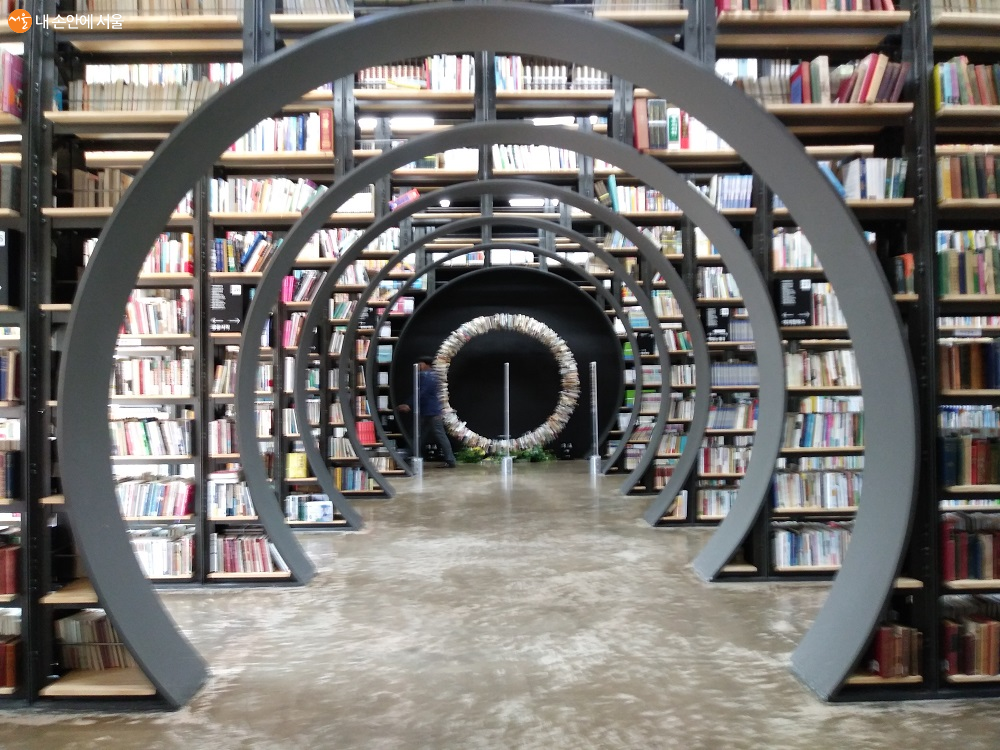 맨 끝지점에 도착하니 마지막 세션, 어린이 서적 코너다. 어릴 적 즐겁게 책 읽었던 즐거운 추억이 떠오른다. 자녀들에게 책을 읽게 하려고 다양한 시도를 하셨던 아버지 생각이 난다. 헌책을 엮어서 만든 서울책보고 상징물 앞에 서니 예술 전시관에 온 착각이 든다. 헌책을 이용한 참신한 아이디어다. 헌책을 하나하나 엮으니 커다랗고 근사한 지혜의 원이 나오는 것 같다. 서울책보고를 우리의 아지트 목록에 추가하자며 우리는 들떠있다. 책 읽기를 작정하고 아예 커피까지 들고 왔다. 읽을 책을 품에 안고 멋진 추억여행 인증샷도 남긴다.