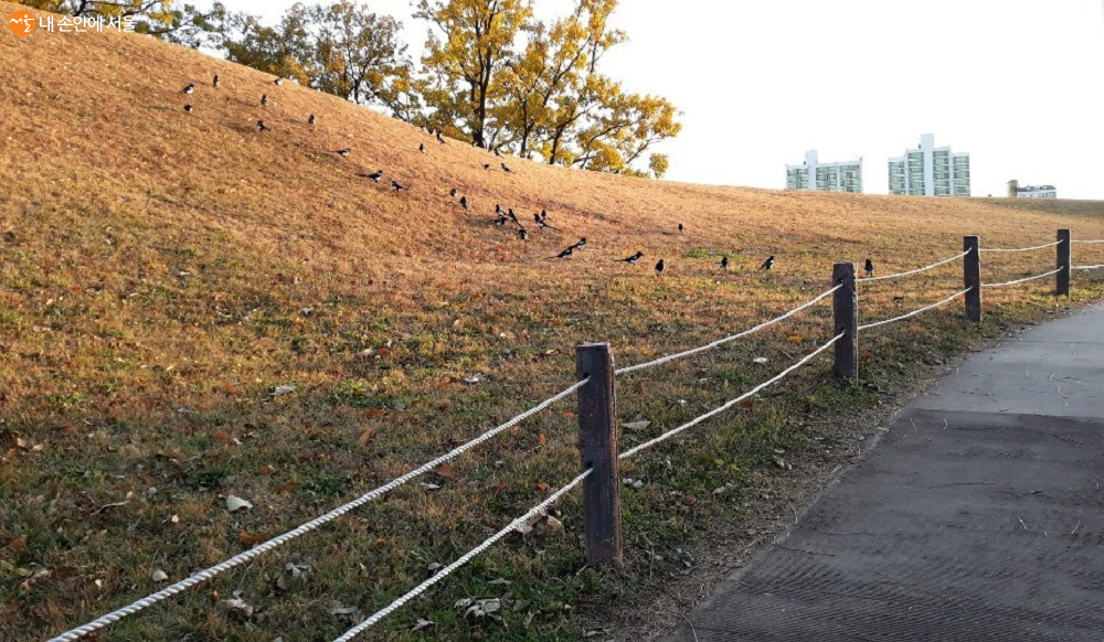 까치떼가 놀고 있는 올림픽공원 산책길 ⓒ이봉덕