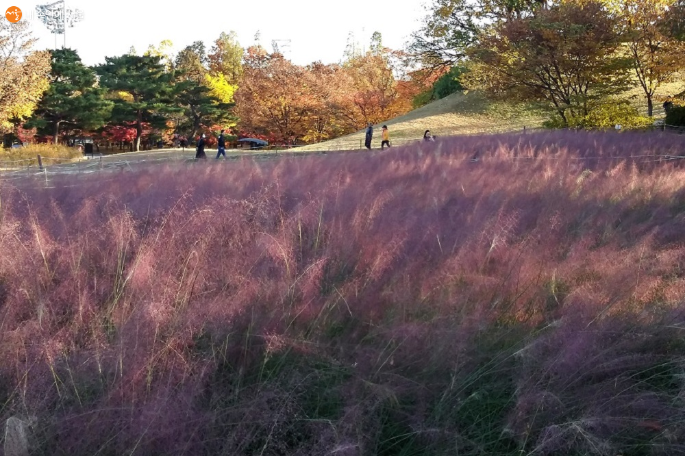 까치 다리 건너 88호수를 지나 가족놀이동산 가는 길, 초가을 핑크뮬리의 핑크빛이 늦가을 퍼플빛으로 바뀐다. 품위 있는 늦가을 패션이다. 평화로운 세상, 이젠 우리도 우아한 기품을 뽐내도 될 것 같다.