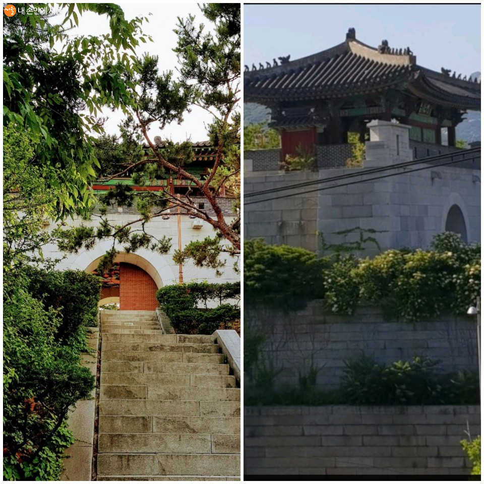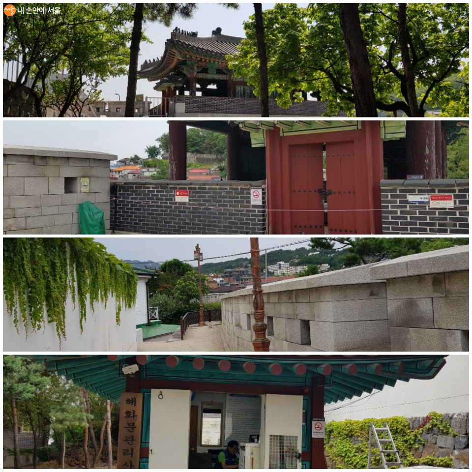 위에서부터 한양도성 4소문의 하나인 동소문 혜화문의 내성쪽 문루, 서쪽 협문, 성곽로, 관리실의 모습 ⓒ김영배