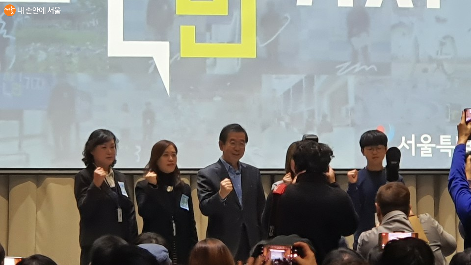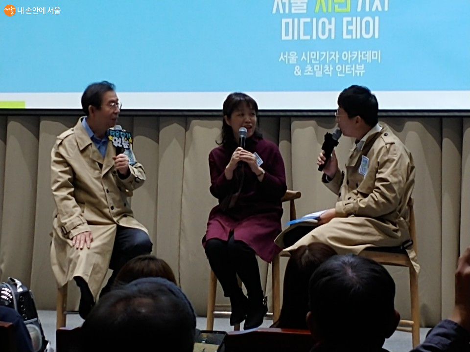 박원순 서울시장(왼쪽)이 '2019서울시민기자 미디어데이' 행사장에서 3년 간 50건을 출고한 김윤경 기자(가운데)와 대담하고 있다. Ⓒ김영배
