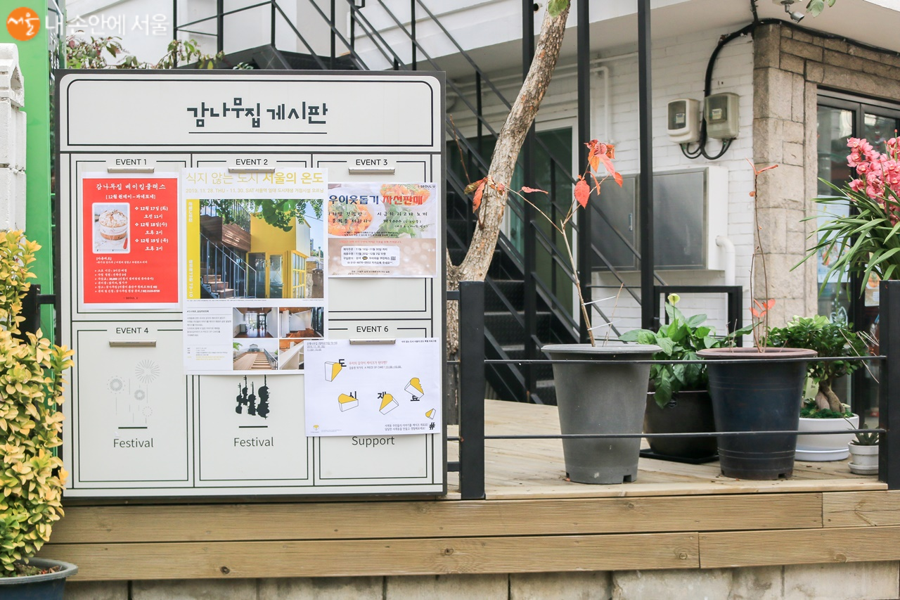 감나무집의 게시판을 보니 이웃주민들과 함께 하는 행사들과 이벤트들 안내가 많았다. 특히 근처에 있는 앵커시설에서 열리는 행사에 대한 안내도 있어 서로 연계하여 발전해 가는 앵커시설에 대한 기대감을 갖게 만들었다.